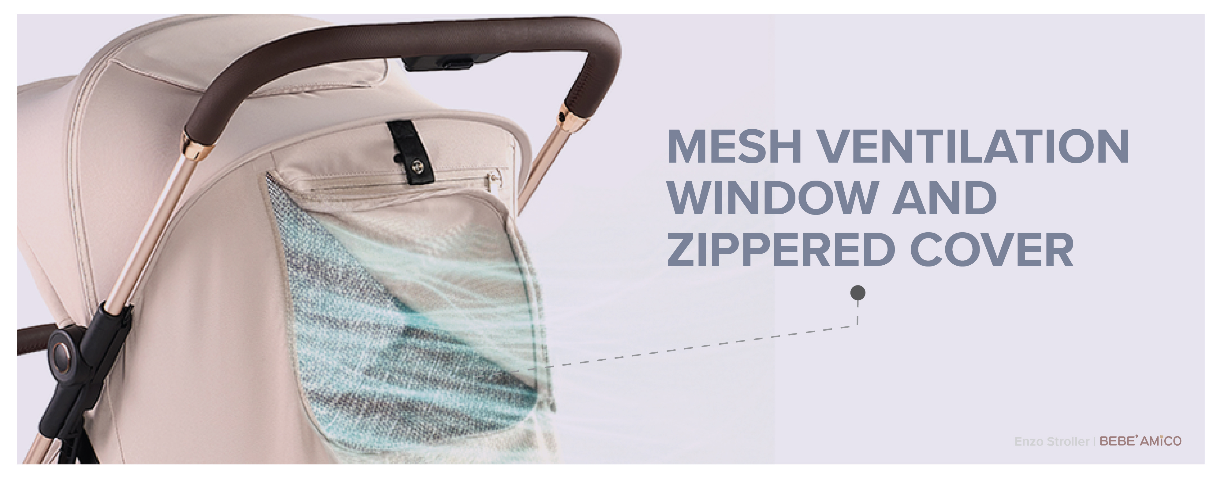 Mesh ventilation window with zippered cover pocket promotes airflow while maintaining privacy, with extra storage for toys, wipes, or bottles.