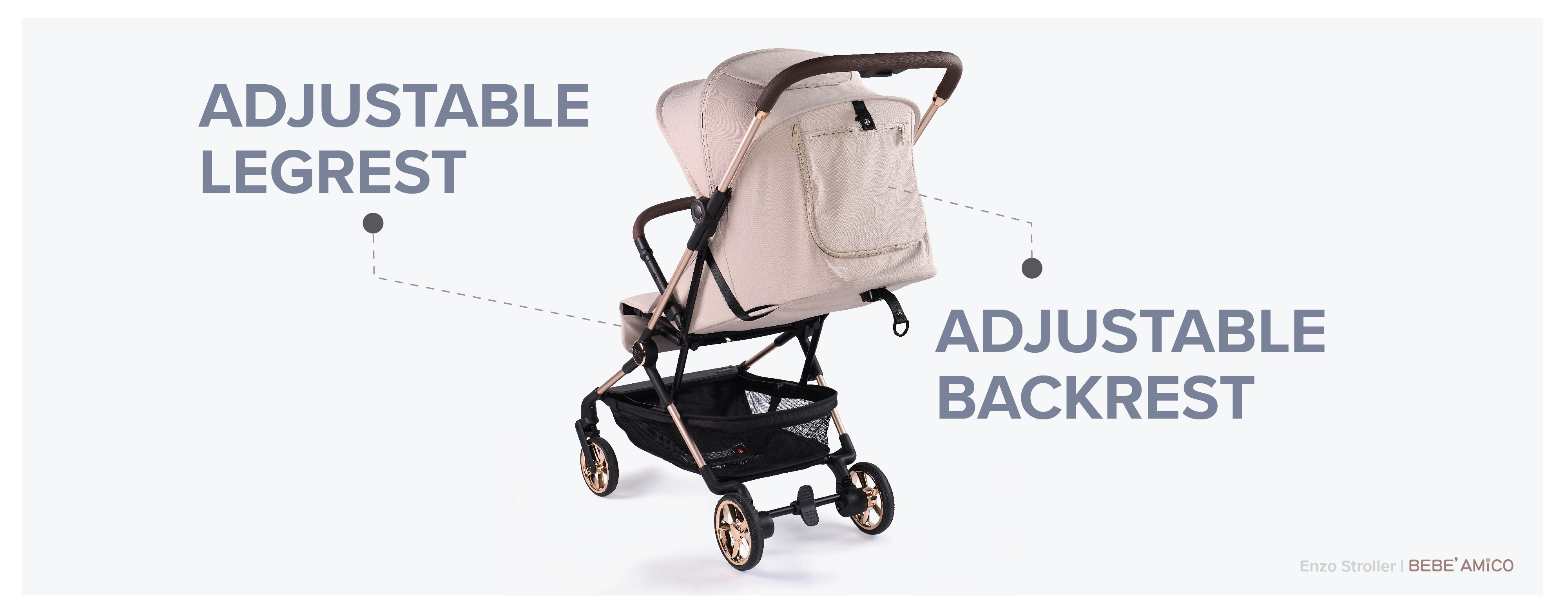 - Adjustable backrest & legrest allow customized comfort — upright for exploration or fully reclined for nap time.