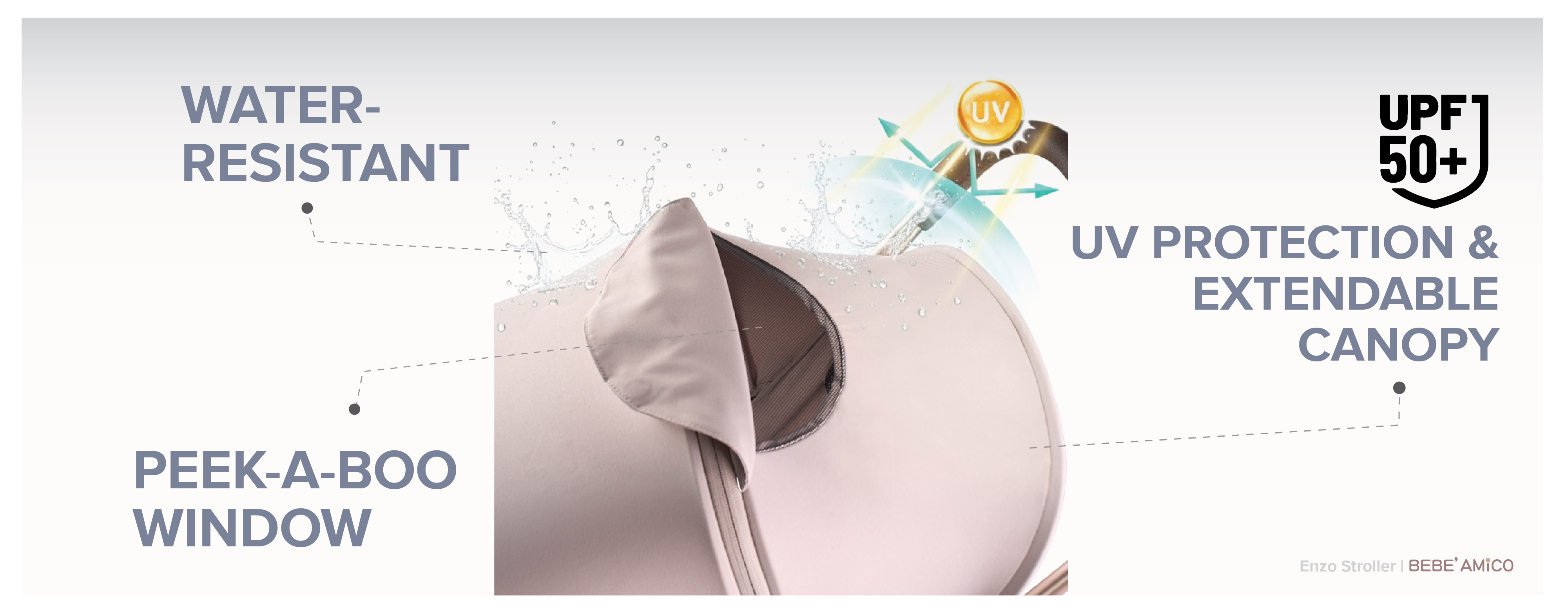 - Extendable sun canopy with UPF50+ protection, shielding your baby from harmful UV rays. Crafted with water-resistant, easy-to-clean fabric and a magnetic peek-a-boo window for quick check-ins.
