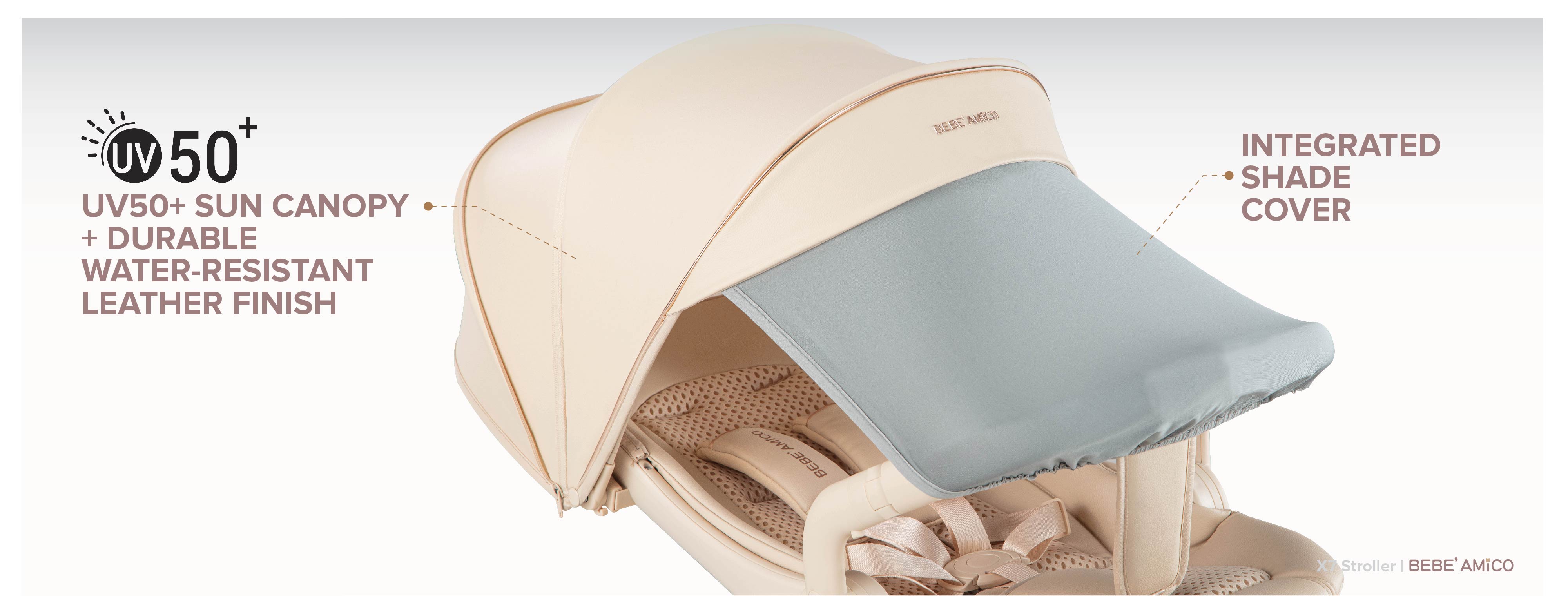 Featuring a UPF50+ sun-blocking canopy, this stroller provides full UV protection while keeping your baby cool and comfortable. The waterproof leather fabric ensures durability and easy cleaning, while the hidden shade cover allow for flexible shading and enhanced privacy, creating a cozy retreat for your little one.